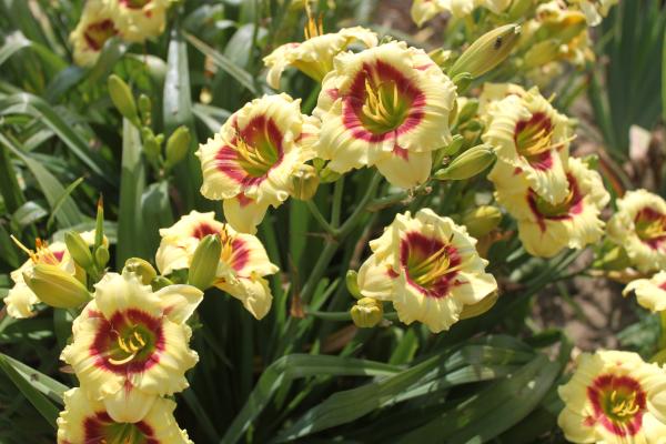 Diese Züchtung von Frohreich aus dem Jahr 2016 ist ungewöhnlich reich blühend, sehr gut verzweigt und macht damit sehr lange Freude. Die Blüten sind eher klein und hübsch, zartgelb mit rotem Auge. Höhe ca. 80 cm, diploid, einziehend