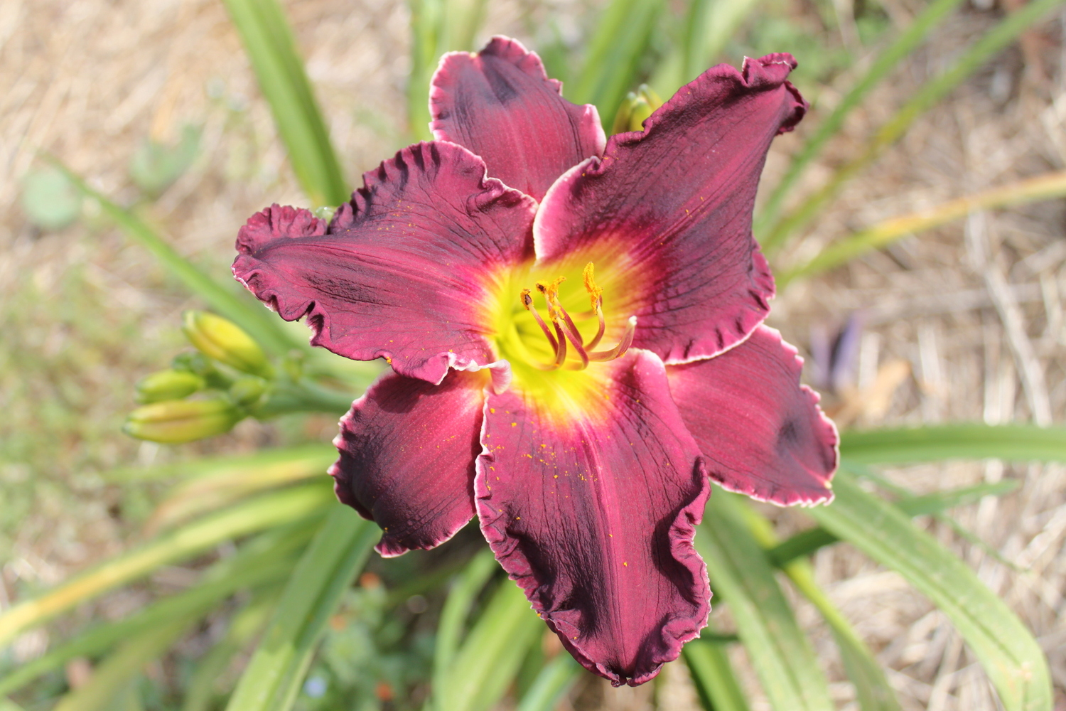 Samt-dunkelrote Blüten mit einem feinen weißen Rand. Besser an einen halbschattigen Platz pflanzen.Höhe ca. 95 cm, gezüchtet von Waldrop 2008, tetraploid, halb-immergrün
