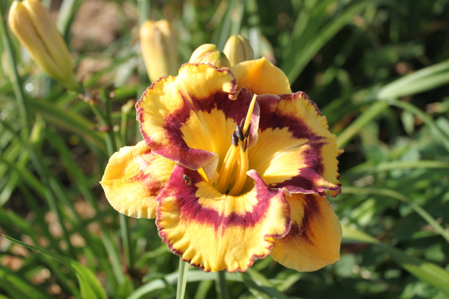 Ihr Kennzeichen ist das besondere Auge, bei dem sich der große gelbe Schlund scharf von dem wie ein rotes Band wirkendem Auge absetzt, dazu ein feiner Rand in gleicher Farbe. Gezüchtet von Stamile 2008, Höhe ca. 70 cm, tetraploid, halb-immergrün