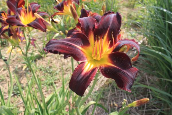 Der Same dieser schönen neuen Sorte stammt von Bernhard Krismer und kam über die GdS Tagliliengruppe zu mir. Als die Pflanze nach 3 Jahren voll entwickelt war, war ich begeistert. Ich denke, ich habe noch nie so dicke Stiele bei einer Taglilie gesehen. Durch sie trägt sie ihre zahlreichen, großen, dunkelroten Blüten mit dem gelben Schlund problemlos. Auch wenn sie eine Höhe von ca. 105 cm hat.Die Stiele sind zudem gut verzweigt - alles in allem eine Schönheit, die sicher Beachtung findet.