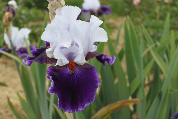 Eine geniale Iris mit zartblauen Domblättern und dunkelvioletten, wie Samt schimmernden Hängeblätter und dazu die orangen Bärte. Und von diesen herrlichen Blüten hat sie eine ganze Menge! Höhe ca. 85 cm, Cayeux 2011