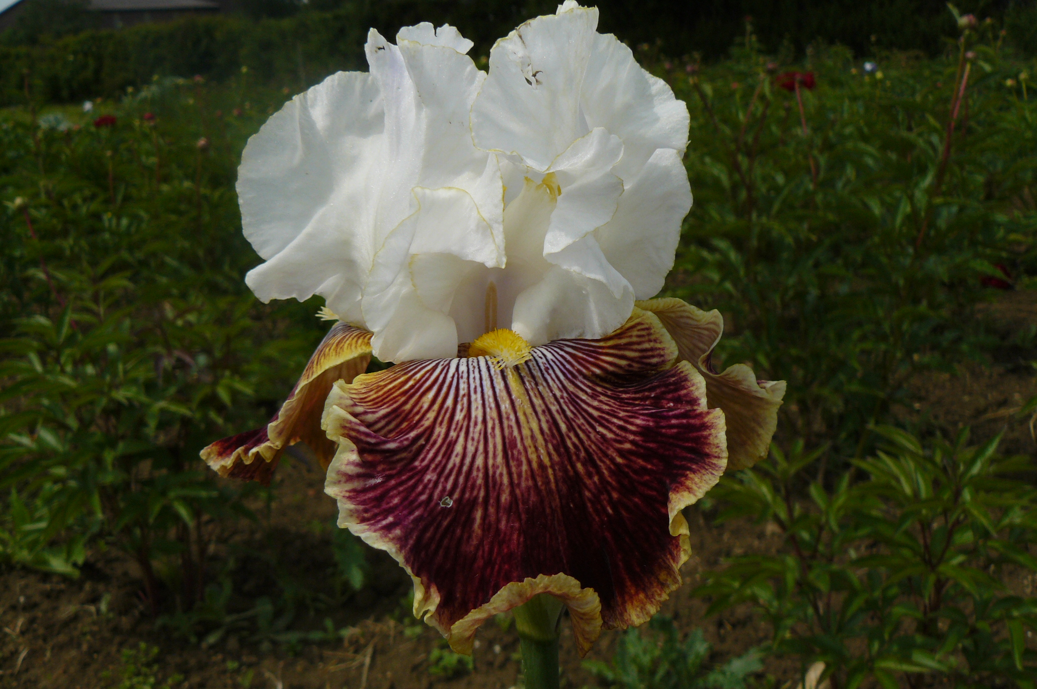 Eine außergewöhnliche und faszinierende Sorte mit weißem Dom und weinroten Hängeblättern in einer wunderbaren Zeichnung - eine Augenweide! Gezüchtet von Johnson 2008, ca 90 cm.Iris werden wurzelnackt zwischen ca. Ende Juli bis Mitte Oktober verschickt.